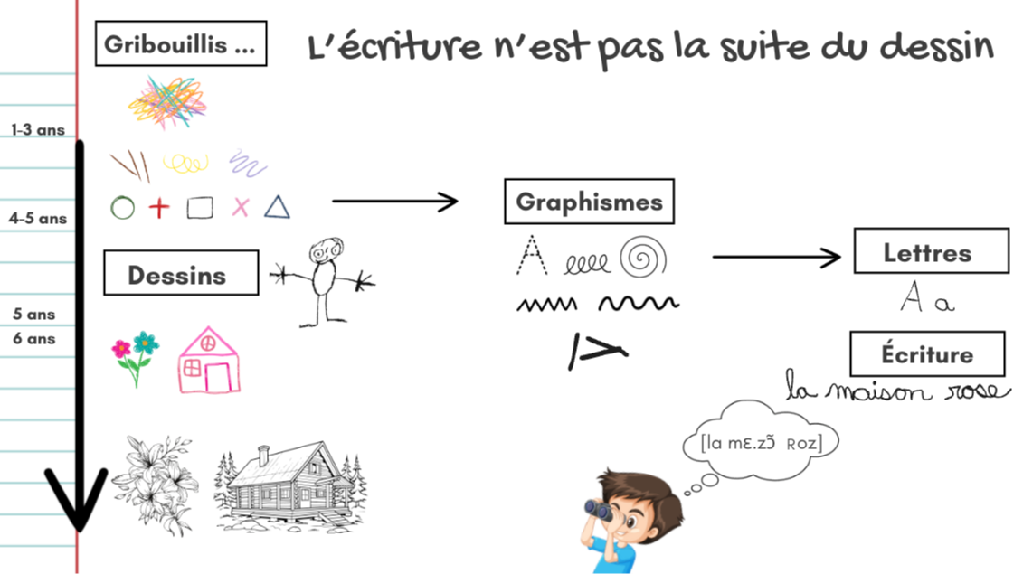 - Préparer la transition symbolique du dessin à l'écriture en distinguant le lieu, outils et le moment de chacune des activités et en limitant l'utilisation de matériel didactique qui combine dessin et écriture, par exemple, la lettre N est couverte de neige pour rappeler que le son « n » est au début du mot neige.
